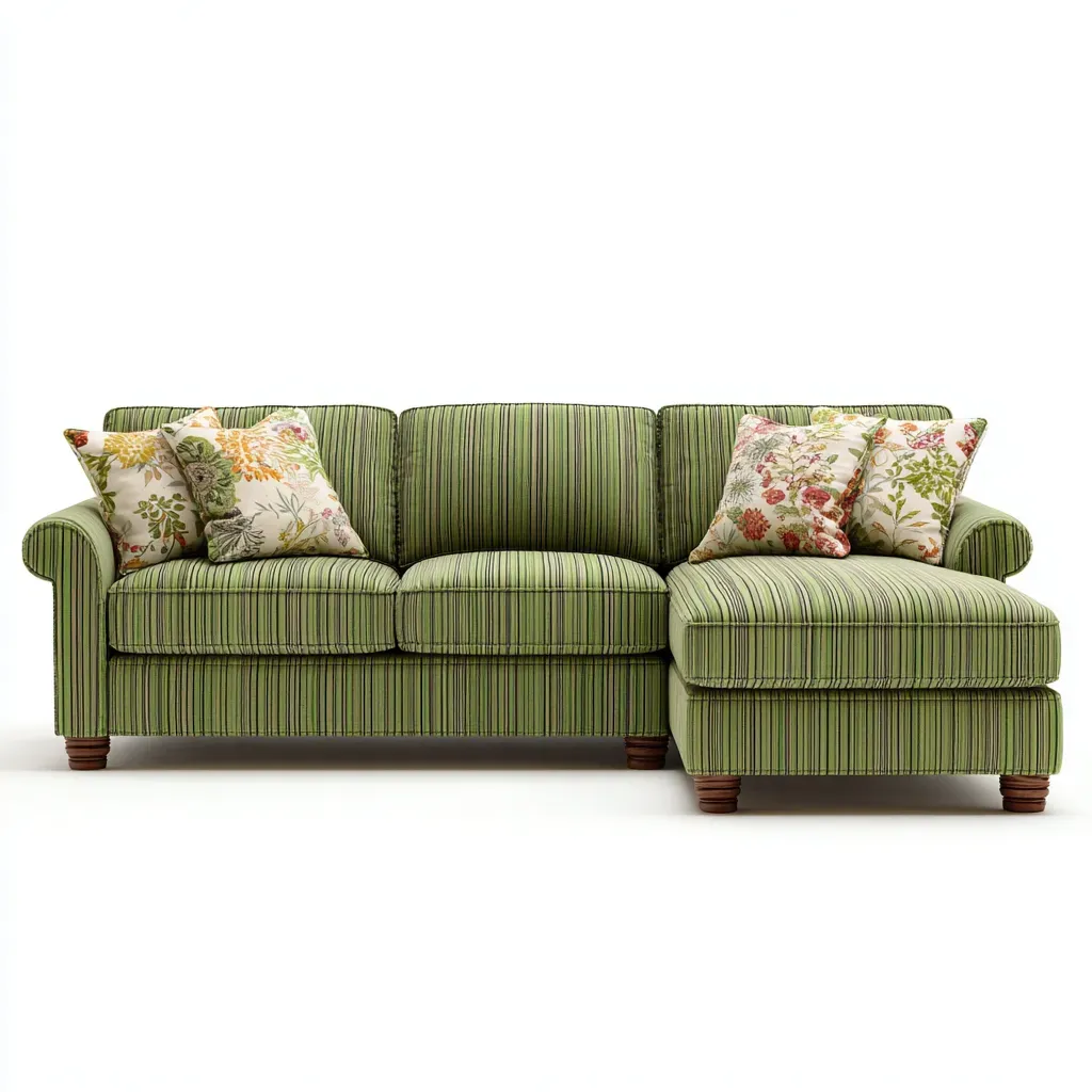 Le revêtement est réalisé en tissu vert olive à texture rayée, offrant un toucher doux et une apparence décorative. La structure repose sur des pieds en bois, apportant une stabilité fiable et une finition traditionnelle.